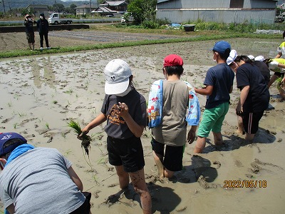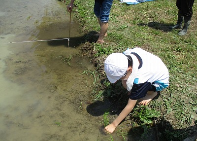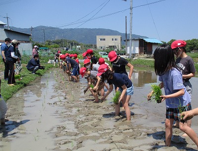 ひものしるしに合わせて田植えが始まりました。初めは慣れない手つきでしたが,だんだん植えるスピードも早くなってきました。
