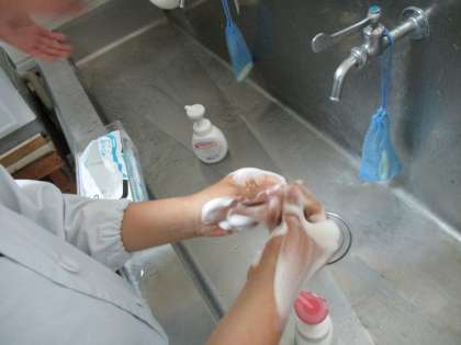 給食前の手洗い,歌を歌いながら丁寧に洗っています。