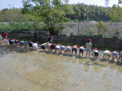 説明を聞き,お手本を見た後,田んぼに入ってみると・・・