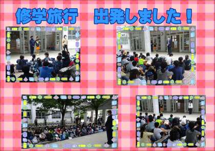 6年生が出発式を終え,学校を出発しました。健康,安全に気を付けて,楽しい2日間にしてください。