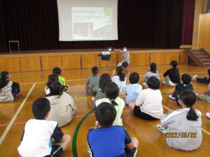 今日は学年で集まって山の家野外活動についての説明を受けました。山の家の動画を見ると,「うわ〜楽しそう。」「やりたいな。」など声が上がっていました。係や班での役割なども紹介しました。
