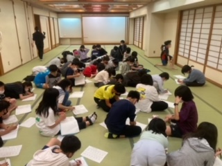 今日1日の行動を自身で振り返り、グループで話し合って、明日の目標を考えています。みんな、しっかり取り組んでいます。