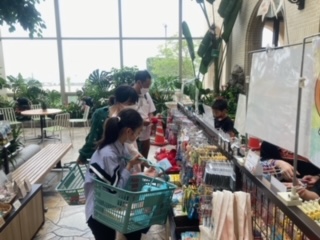 「あといくら残っているかな?」お金の計算をしながら最後の買い物を楽しんでいます。