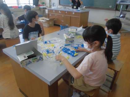 電池の学習では,3年生で学習した回路のつなぎ方を生かし,送風機作りをしました。