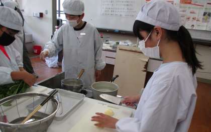 2組は初めての調理実習でした。今日は,ゆでいも(じゃがいも)と青菜(ほうれん草)のおひたしを作りました。実習前にもう一度手順や切り方を確認して,いざ実習。