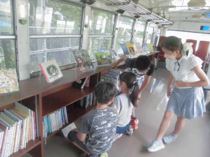 ゆうゆうバスから読みたい本を選び,友だちと楽しそうに読み合っていました。