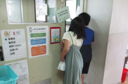 今日は,中庭で花の水やりをしている栽培委員さん,手洗い場のせっけんを点検し,補充している保健委員さん,図書室で本の貸し出し返却をしている図書委員さんが活動していました。