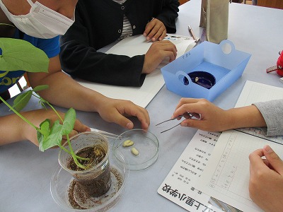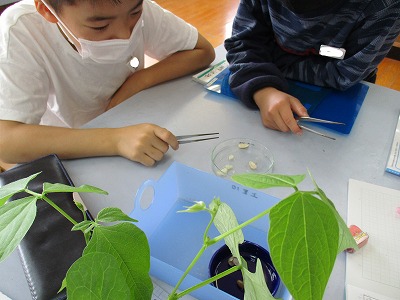理科では,インゲン豆をカットして,ヨウ素液をかけてどうなるかを予想し,実験しました。インゲン豆では,皮をピンセットで取るのに苦労していました。青紫より黒っぽい色に変化していましたが,反応があることが確認できたようです。