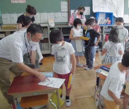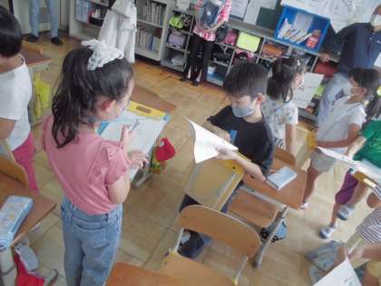 英語活動の「いくつかなクイズをしよう」では,前回の学習で作ったいくつかなクイズを実際に友だちと出題し合いました。