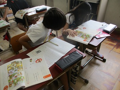 絵に描かれた内容をを参考にしながら,お話作りをしている3年生。ただ単に文章をつくるのではなく,文と文をつなぐ言葉を取り入れながらお話を作りました。