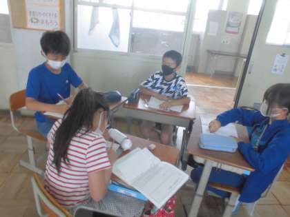 ある話題に対して賛成か反対かの立場を決めました。話題は「学校の学習では,鉛筆よりシャープペンシルの方がよい」などです。それぞれの立場に沿って,理由や事例を考えました。考えたことを基に話し合いをしました。自分の考えが深められるように,質問や反論などを考えながら話し合いました。しっかりと話しを受け止めている姿勢がよかったです。