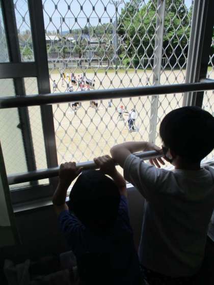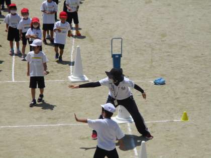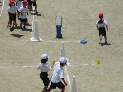 今日は交流体育で,リングバトンを使ったリレーあそびを行いました。