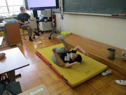 「とうとう あなに すっとんとん♪」の音読に合わせて,おじいさんに扮した子どもたちが次々と転がっていきました。