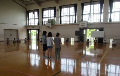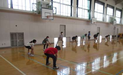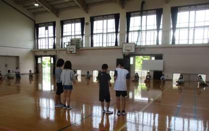 ゲームの進行者がゲームの説明をし,ゆっくりのテンポで練習しました。進行する人は,みんなに指示をして動かすことの難しさを感じたようでした。