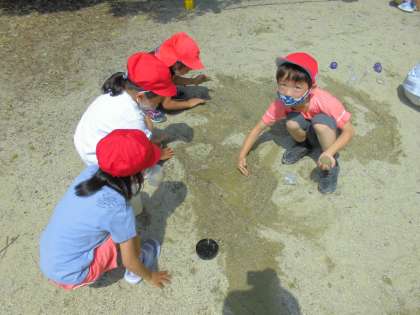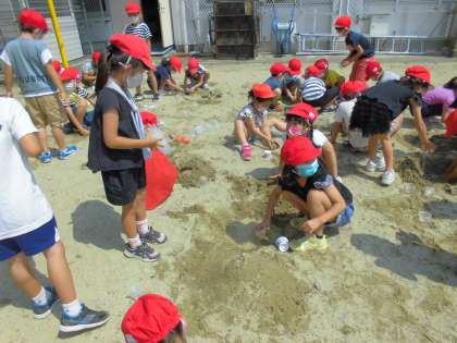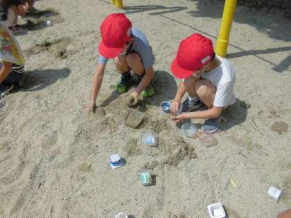 砂や土をたくさんさわって感触を楽しみ,いろいろなものを作りました。