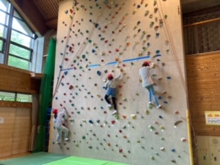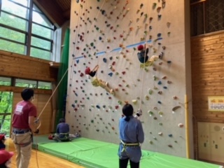 ボルダリング&クライミングを体験しています。始めての児童も多い中、声援して励まし合いながら頑張っています。