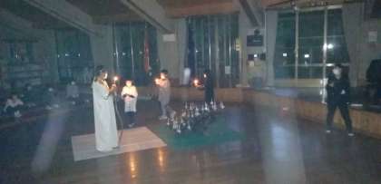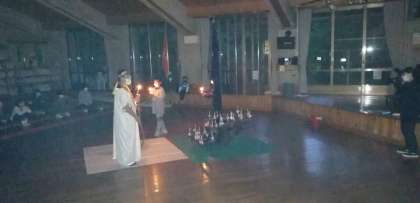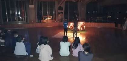 雨の心配があるため、予定を変更して館内でキャンドルファイヤーをしています。火の神がキャンドルに火を授け、その後、係りによるレクレーションが始まりました。