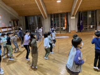 「あんたがたどこさ」の曲に合わせてリーダーの真似をしています。