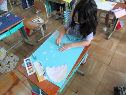 切ったたまごを画用紙に貼り,たまごから出てきたものを描きました。