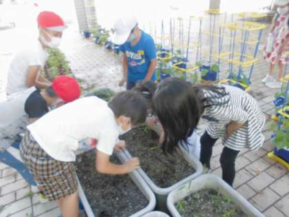 ひまわり,まりいごうるど,おしろいばな,おじぎそう,ふうせんかずら,ほうせんか,こすもす の7種類の種をまきました。