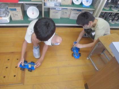 今日の理科の学習では,モーターや乾電池,豆電球をつないだ車を走らせました。