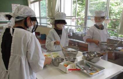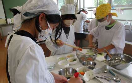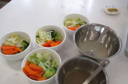 キャベツをゆでるととても色鮮やかな黄緑に変わり,とてもおいしそうでした。子どもたちには和風ソースが人気でした。