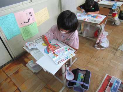 友だちの作品も参考にしながら色混ぜにチャレンジしていました。