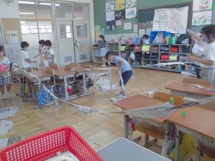 新聞紙を細長く切り、それをのりやテープでつないだり、つるしたりしていきました。