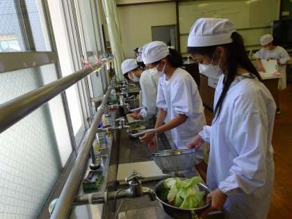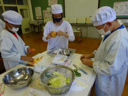 家庭科では「朝食から健康な1日の生活を」の学習で調理実習を行いました。まずは,にんじん・ピーマン・玉ねぎ・キャベツ・もやしを水で洗い,食べやすい大きさに切りました。
