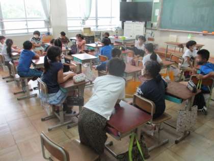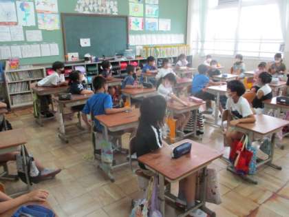 ここ最近は,とても高い気温が高くなっています。運動場も暑さ指数が基準を超えていますので,休み時間に運動場で遊ぶことができなくなっています。本日(7月4日)は,悪天候のため運動場で遊べなくなりました。クラスの係活動の遊び係も室内でできる遊びを考えてくれて,本日の中間休みに「しりとり」をしました。室内でも,楽しく遊ぶことができました。