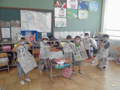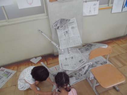 図工の「しんぶんしとなかよし」の学習では、新聞紙をいろいろな方法で使って、イメージしたものを作り上げていきました。