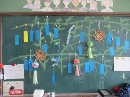 クラスのイベント係が教室の後ろの黒板に笹の絵をかいてそのくれて,その笹にみんなの願い事を書いた短冊を貼りました。
