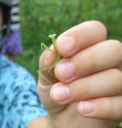 1時間目、畑へ野菜を確認しに行った際にカマキリを見つけました。