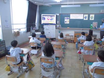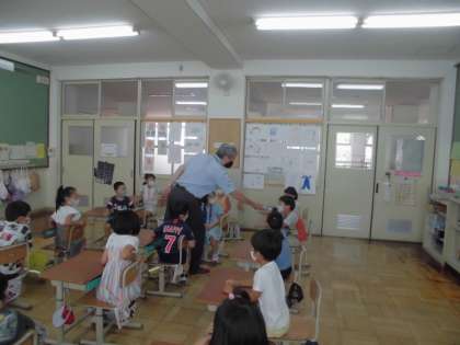 今日は警察の方に来ていただき、警察官のお仕事や防犯についてのお話などを聞きました。