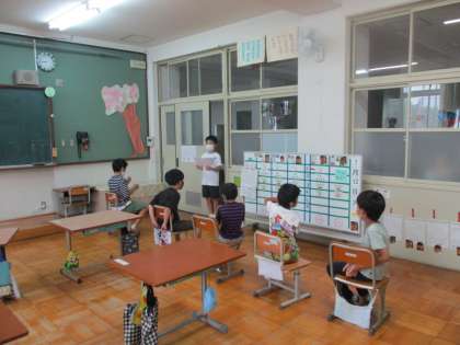 3くみの子たちは毎日全員名札を付けることができていたので,今日の児童朝会で表彰されました。