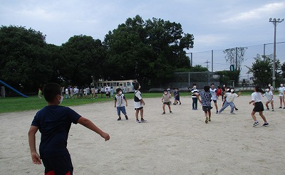1組は、芝生ではないちもんめ。2組は、ドッジビーをしました。クラスの友だちと遊ぶのは楽しいものです。みんなわいわいととても楽しそうでした。
