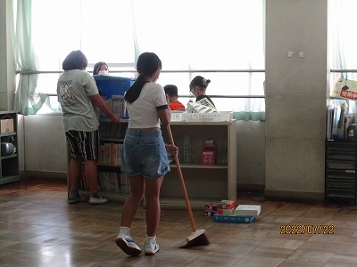 5時間目の大掃除。2学期をピカピカの教室で迎えたいと、しっかりと拭き掃除をしていました。また、棚をのけて掃除するなど、普段できないところもきれいにしていました。最後に教室から自分の机といすを廊下に出しました。