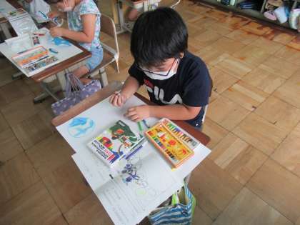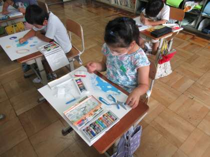 絵本の読み聞かせを聞いて、想像したことを絵に表します。