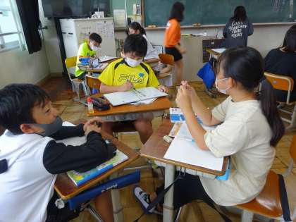 国語では、身の回りにある課題について考え、提案文を書きます。今日は、上里にあるよいところ・課題のあるところを班で話し合いました。