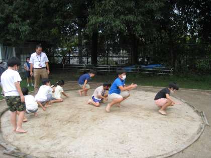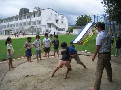11日(日)の大原野神社の「御田刈祭」での相撲大会に向けて、練習に取り組んでいます。運動場のわきにあった土俵を手入れしていただき、土俵もきれいになりました。出場する5年生が練習していると、その様子を見てたくさんの相撲入門生が。みんなでやると楽しいですね。最後は校長先生も。もちろん勝負は…。