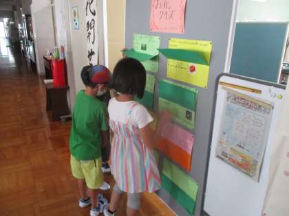 ので,子どもたちは楽しみながらクイズの答えを考えていました。花への