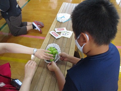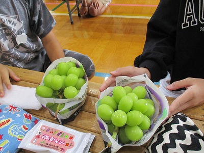 最後に、ぶどうの食べ比べがありました。シャインマスカット、ピオーネ、クイーンニーナを順番に食べました。甘さ、甘さと酸味、皮の苦味など、それぞれのよさがありました。子どもによっても気に入ったものが違いました。