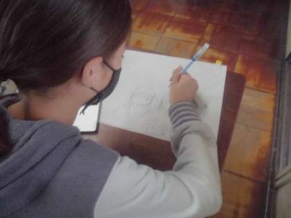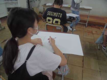 お話の絵の下絵を描いています。構図をしっかりと考えたり、人物の表情を考えたりそれぞれ工夫して絵を描いています。