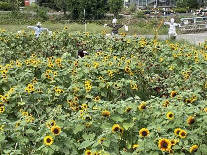 ひまわり畑にもかかしが…