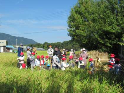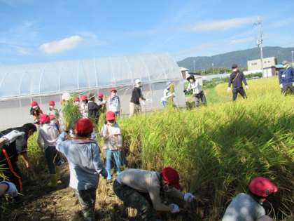 とても良いお天気の中、稲刈りが行われました。たくさんの2年生、5年生の保護者の方、PTAのみなさんにもお手伝いいただきました。子どもたちが刈った稲を束にして結んでいただいたり、干すお手伝いをしていただいたりと大変お世話になりました。ありがとうございました!