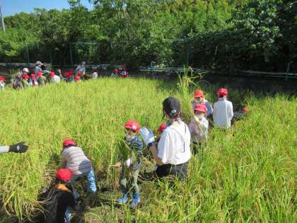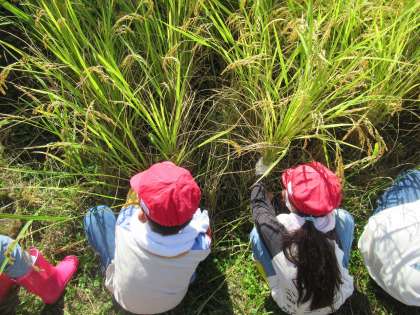 しっかり実った稲穂を、みんなで力を合わせて刈り取りました!