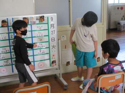 今日の朝の会では、文字を読む手伝いをしている子がいたので写真を一枚撮りました。