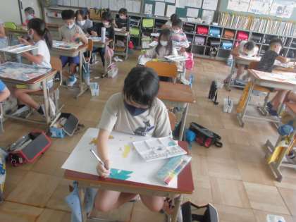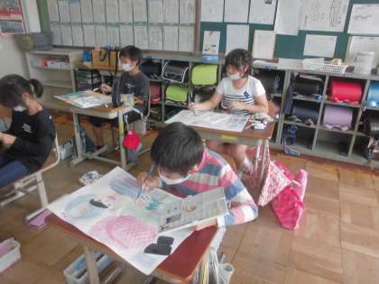 登場人物や後ろの建物の色を塗った後は,スポンジでポンポンと模様をつけたり,網とブラシを使って絵の具を飛ばしたりと,これまでに学習した技法を使って背景を塗っていきました。