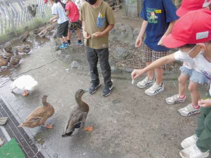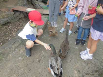 餌をあげながらアイガモの背中をなでることもできました。