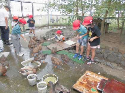 白菜を小さくちぎってあげると、大喜びのアイガモ達。